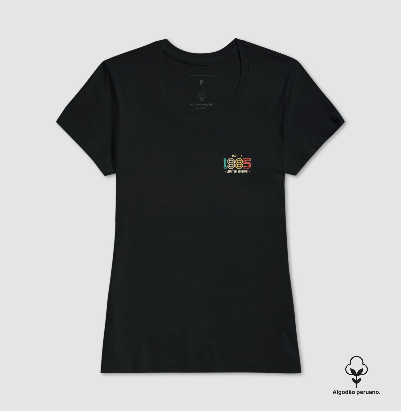 100% algodão peruano (fibra longa, penteado) para um toque sedoso, caimento leve e maior resistência ao uso e às lavagens.